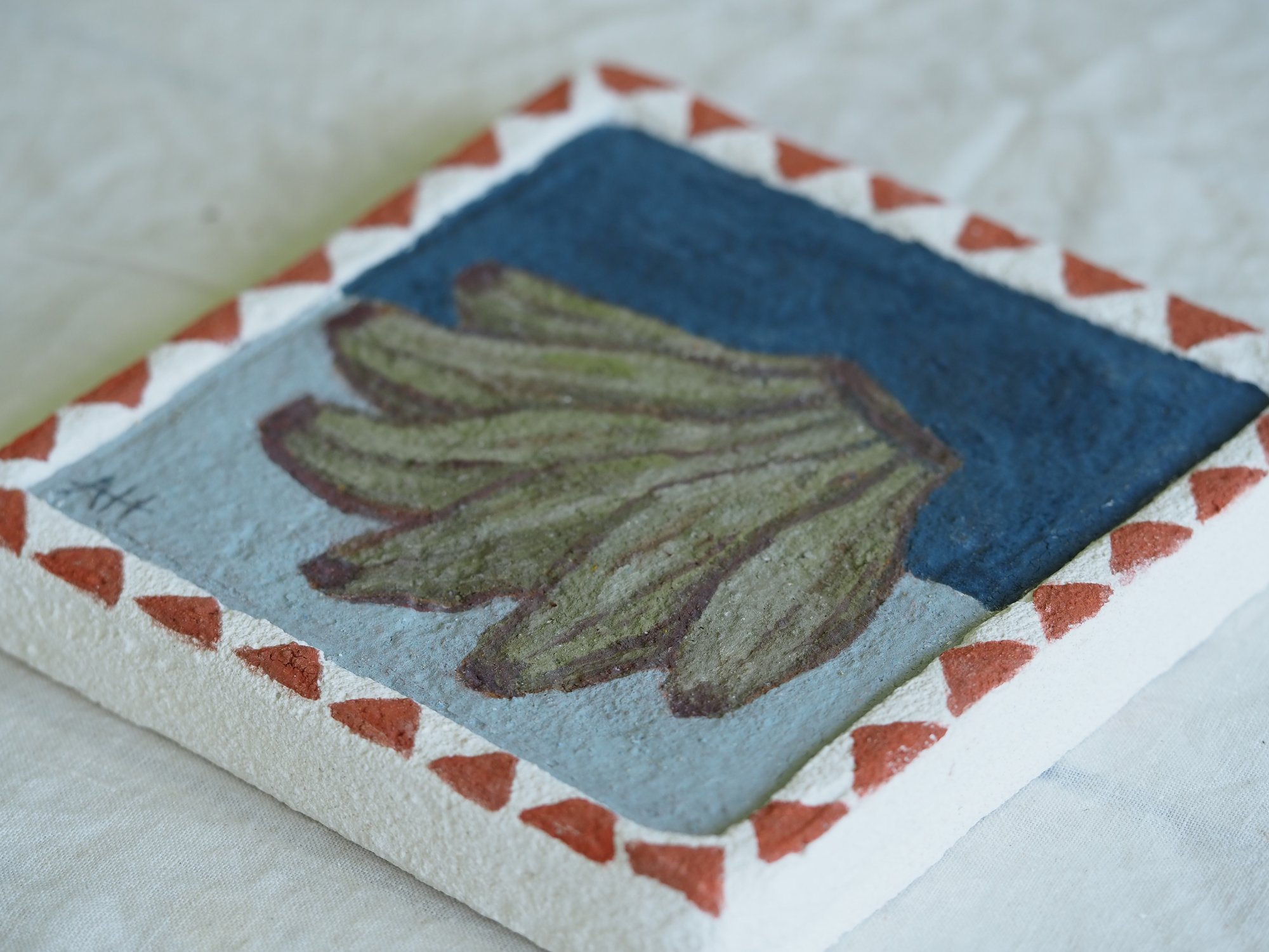 Original plaster plaque artwork. This piece is individually handcrafted and one of a kind. It features a raised plaster border/frame with painted details.